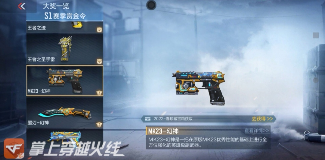 MK23-幻神作为新晋的狙击必备副武器,它的获得方式却十分简单,由赏金令获得,在赏金令450级开启碎片兑换,想要入手也是相当简单,没有太大门槛,只要你开通黄金赏金令,再稍微肝一肝,那么拿下MK23-幻神简直易如反掌!