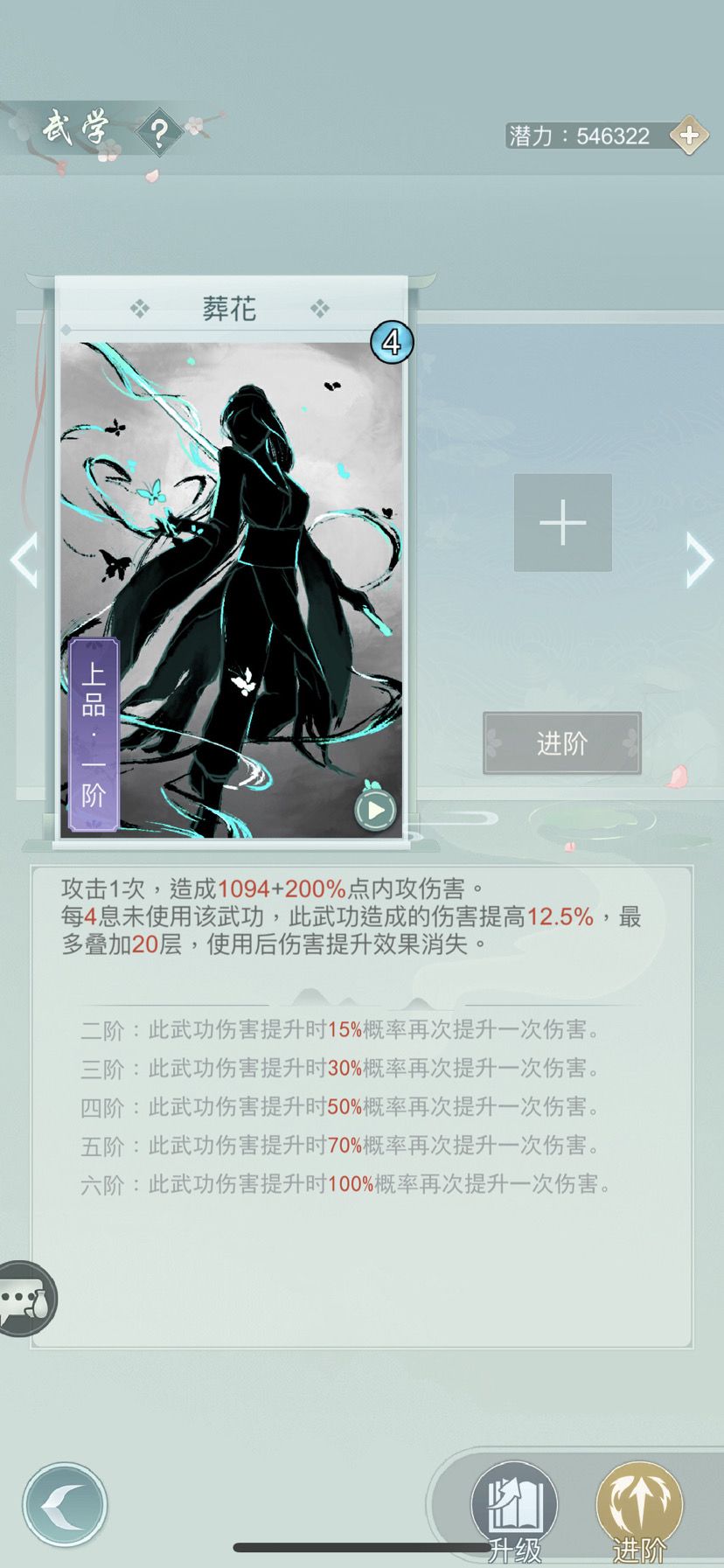单看60级葬花的武学系数,基础系数比烟雨岚还高(下图烟雨岚)葬花属于明显的终结属性,更适合花印轻剑,快速刷出4息增伤,20层满效果增伤250%,6阶葬花共需要10回合。