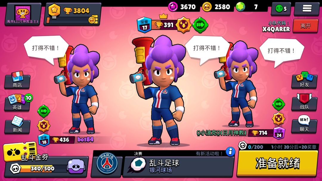 巴黎足球赛相对来说简单很多,毕竟官方想送皮肤给大家。在这里建议大家组队打,推荐一套比较稳的阵容,拳王、大锤、迈尔特(双枪)或者奶爸。大锤有大招的时候,别带球,把球给队友。然后大锤开大砸对面大门,队友此时带球射门即可。但是特别注意大锤容易被集火秒掉或者被断大招。––日月神教