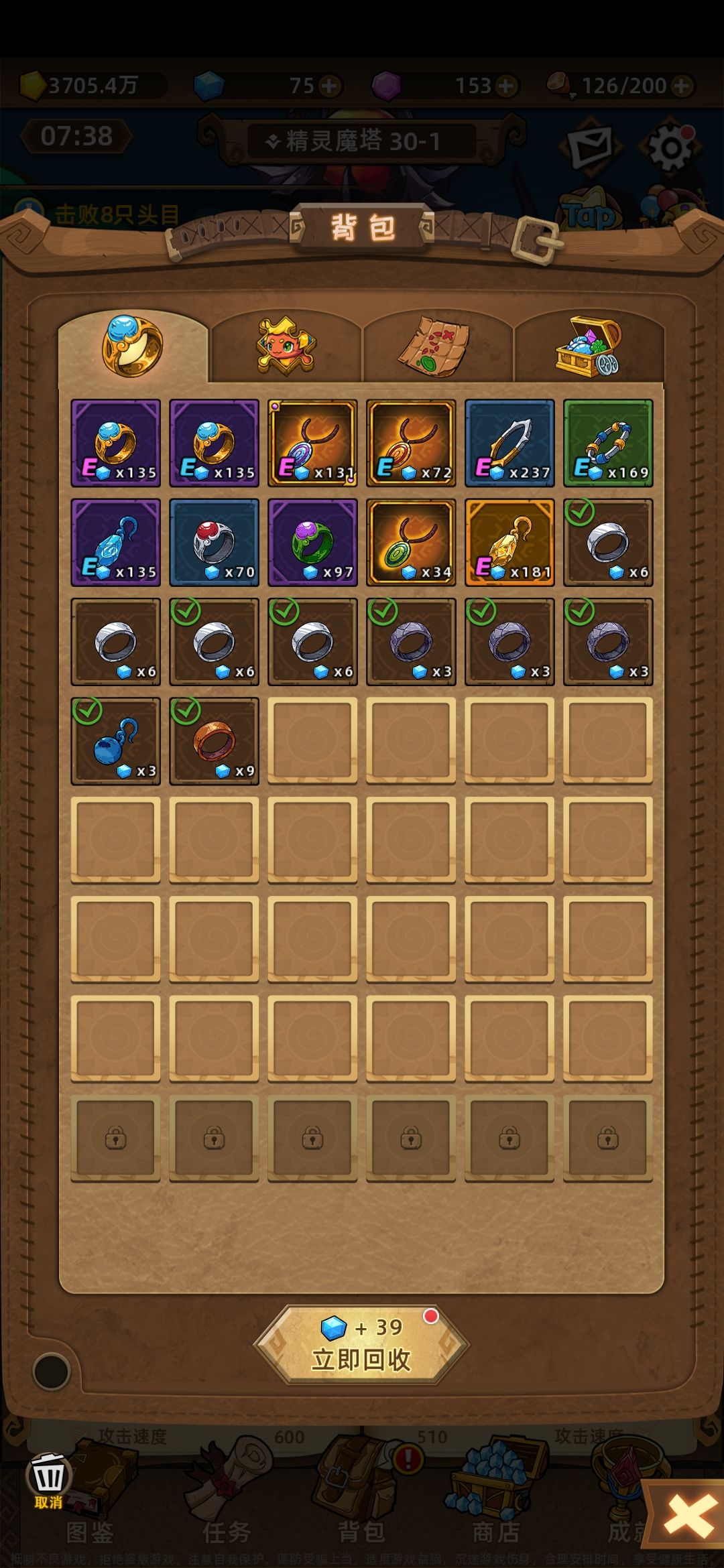 2、戒指首饰合成要钻石,而这游戏钻石奇缺,前期合成浪费了巨多钻石。接下来干货,左下角有个回收键,点进去可以把没用的分解了,可以白嫖钻石,我昨晚才发现![[嗒啦啦2_起了杀心]](https://img.tapimg.com/market/images/347f4af191f7dbd436f74aabcf4616a9.gif)