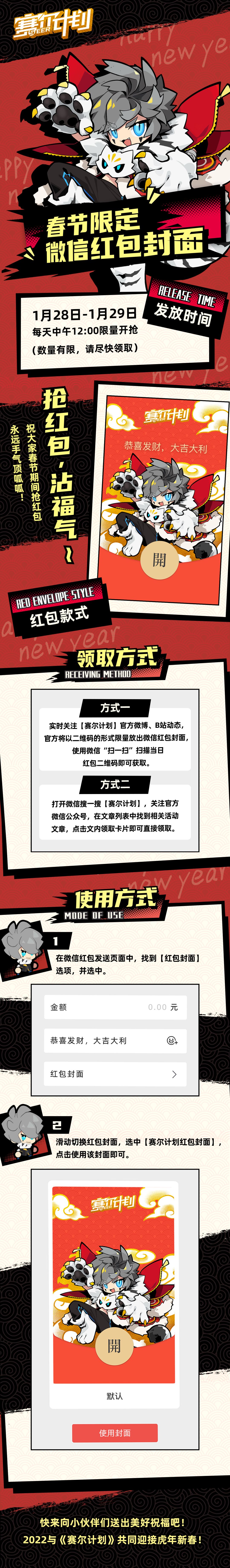 1月28日、1月29日,每日中午12:00,实时关注【赛尔计划】官方动态,官方将以二维码形式限量放出微信红包封面3000份,使用微信“扫一扫”扫描当日红包二维码即可获取,数量有限,领完为止。微信红包封面有效期3个月。