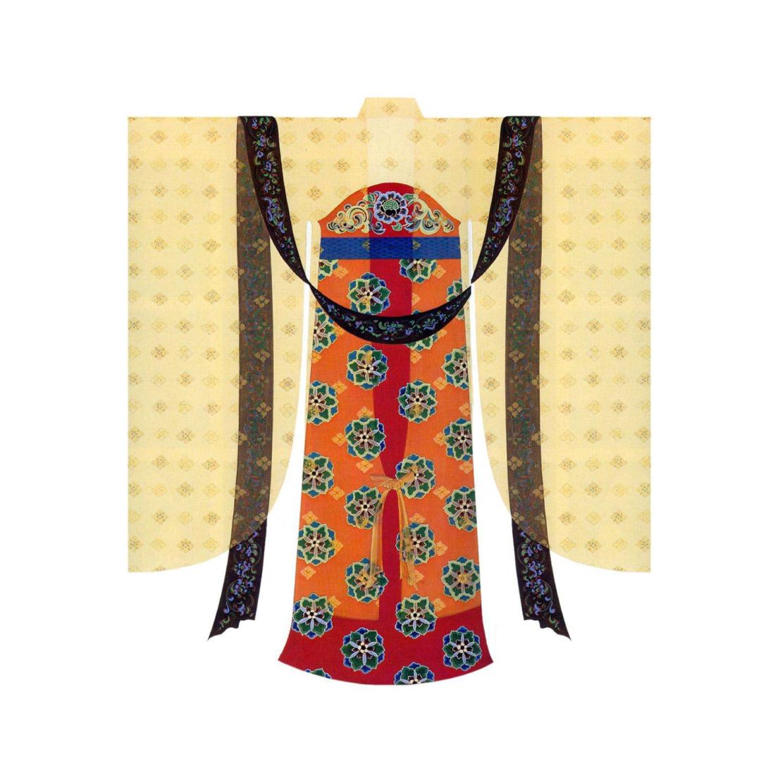 秦朝始有披帛,以缣帛为之,汉时用罗布制披帛,唐代开始广泛流行。披帛通常以轻薄的纱罗或绸缎裁成,上面用银花或金银粉绘制纹样。