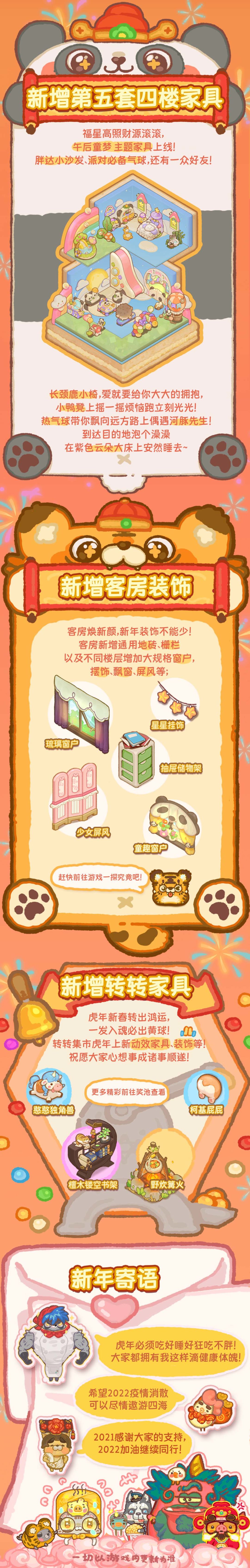 【2.11.0版本旅店齐欢聚·虎年寅新春重磅更新来袭】“压岁钱大作战”’将于2022年1月27日6:00开启,新年限定“萌虎闹春”系列家具等你通关赢取!乌冬新年套装“布老虎”“乌家傻妞”陪过喜气洋洋过大年!限时背景搭配古风外观“红尘客栈”营造满满氛围感!团圆宴当然少不了泰坦研制得餐厅春节新菜单!
