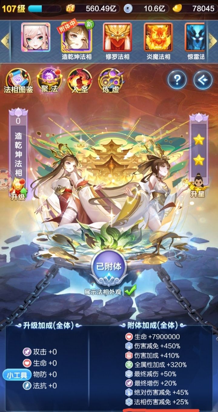 我是穿了2星紫虚法的,而上面的计算结果没把法相伤害加减算进去,由此得出法相伤害加减不加战力