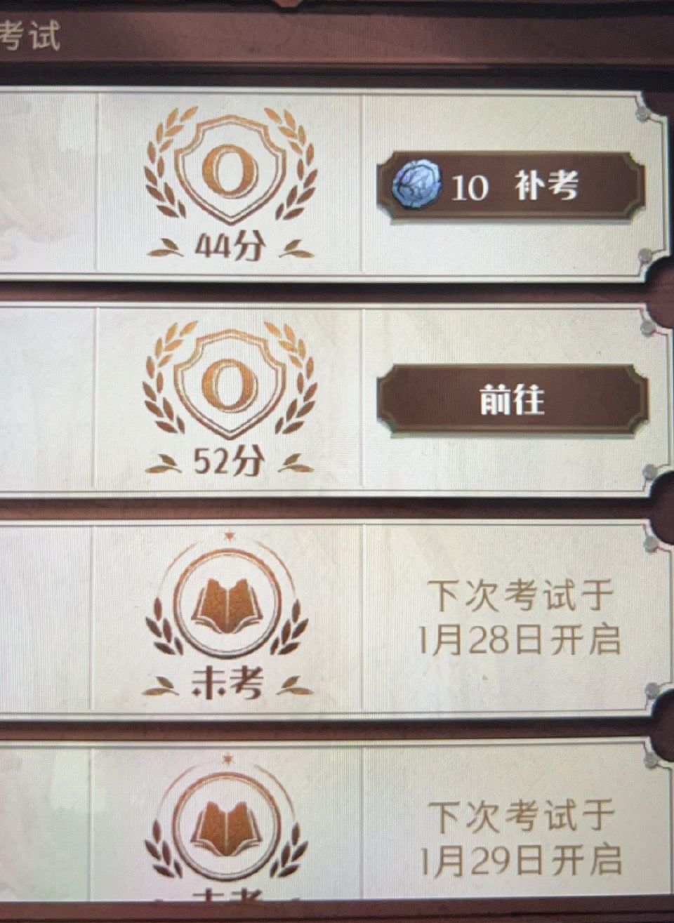 要通关前一个等级的考试才可以开启高等级的考试。