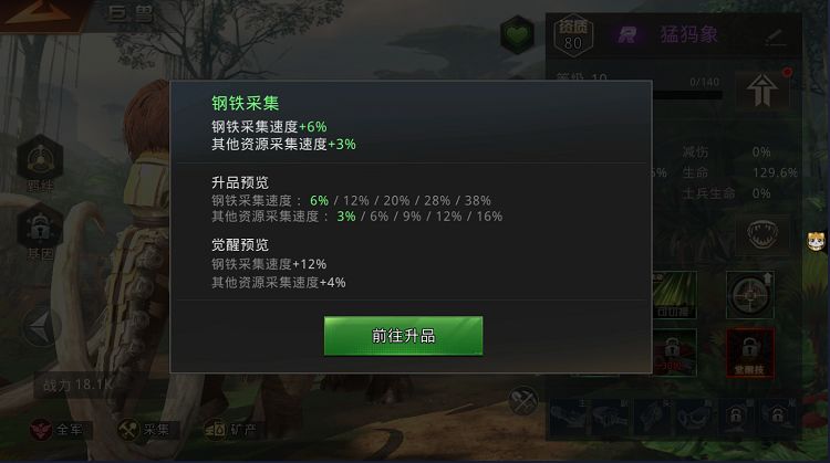第一点:要有对应各资源的采集兽,猛犸-钢铁,长颈龙-金子,牛龙-番茄,装甲角龙-石油。首先,大量收集这四种巨兽,经验堆到十级,开启各自的采集加成技能。