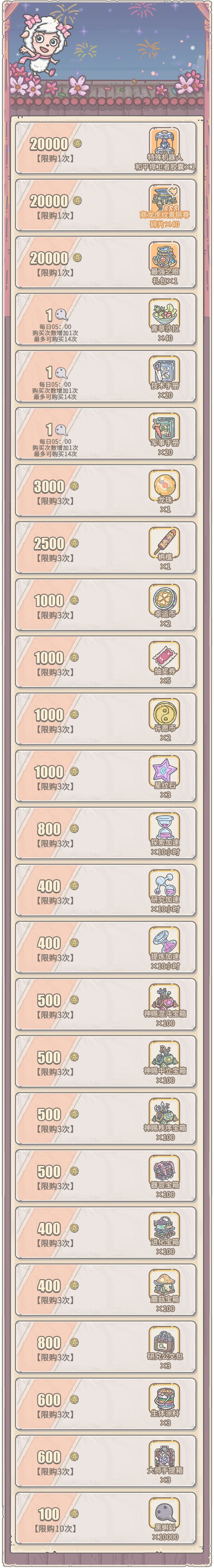 2、活动期间,每日会刷新售价1白蝌蚪的青草沙拉,技术手册和军事手册,若未购买,则会累计购买次数,直至活动结束