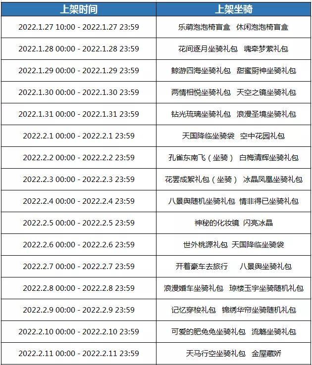 本期活动商城将上架新品道具全家福礼包、春联礼包、民国爱情服装包、芳华坐骑礼包、春节超值限购、一元春节盲盒、十元春节盲盒、灼灼芳华碎片礼包、蝶之升华进阶碎片礼包、笑春风进阶碎片礼包、锦鲤贺岁进阶碎片礼包、柿柿如意进阶碎片礼包。