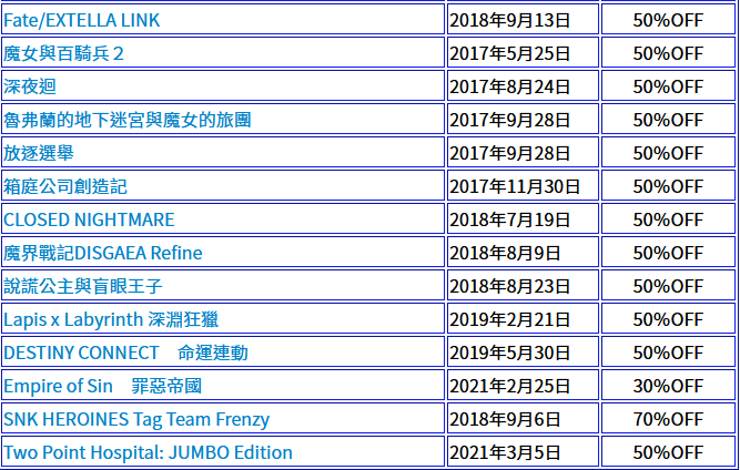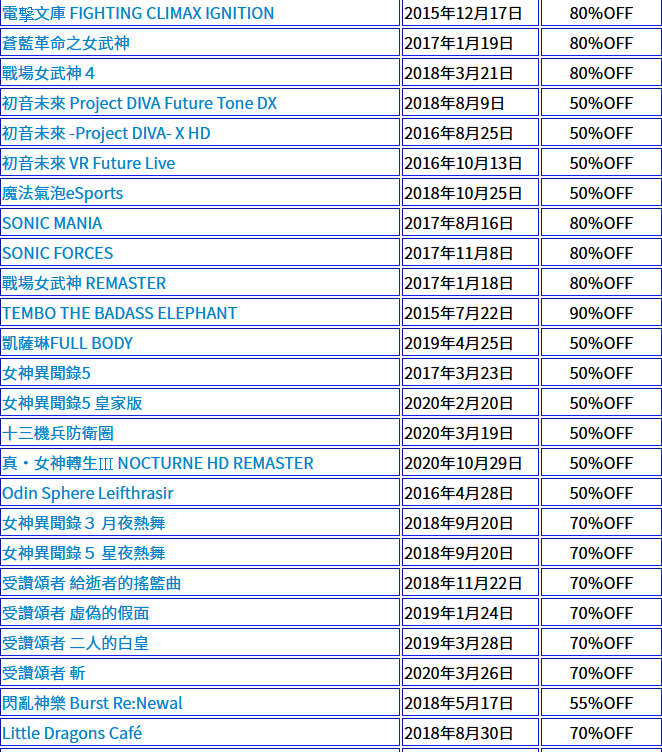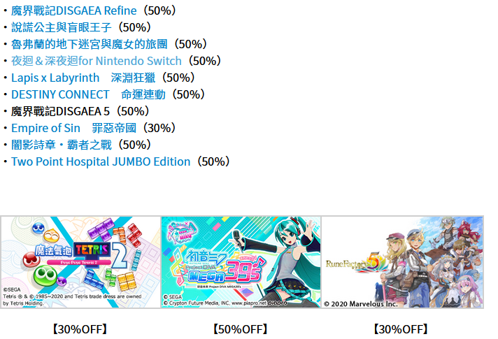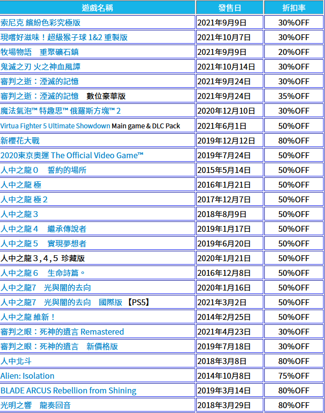 此外,《审判之逝:湮灭的记忆》、《鬼灭之刃 火之神血风谭》等去年年底发售的作品,以及《人中之龙7 光与暗的去向 国际版》、《女神异闻录5 皇家版》、《真・女神转生Ⅲ NOCTURNE HD REMASTER》等人气作品也将以优惠价贩卖。PS Store总计有60款以上,eShop则有30款以上的游戏参与本次特卖。