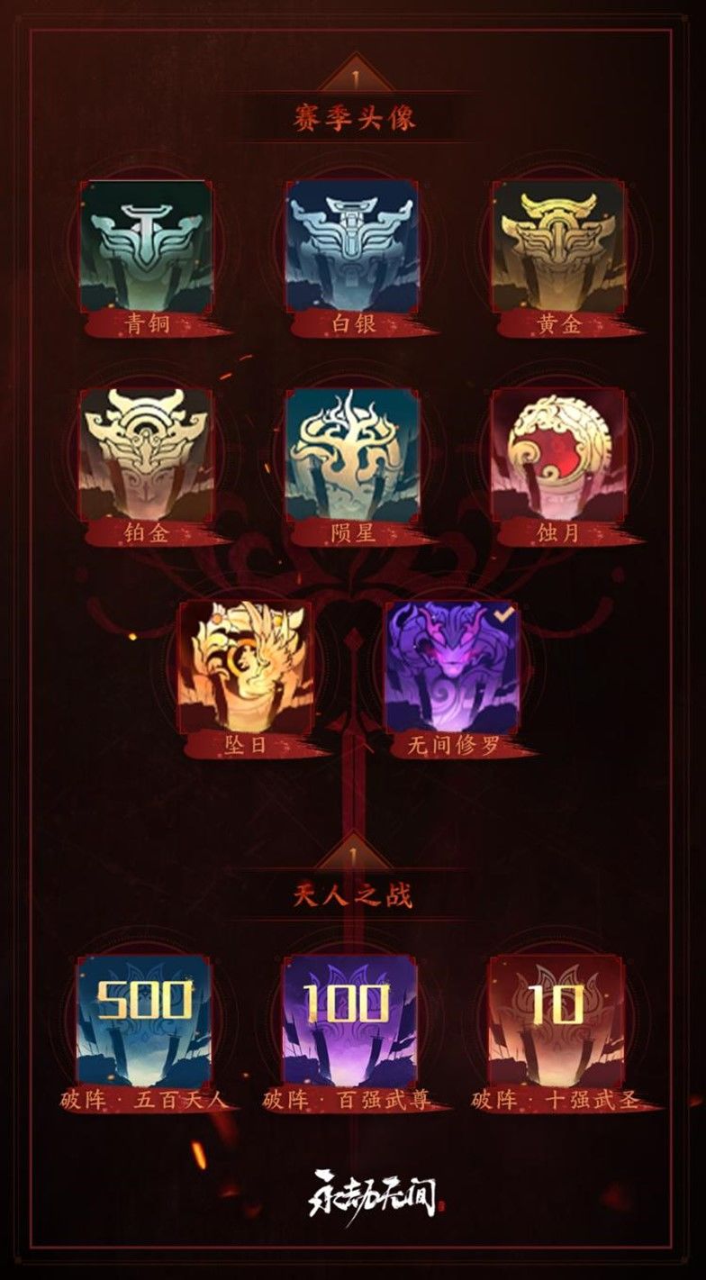 赛季结算时,根据玩家在破阵赛季获得的天人榜历史最高称号,发放本赛季的社交头像奖励。分别为:社交头像【破阵·五百天人】、【破阵·百强武尊】、【破阵·十强武圣】。