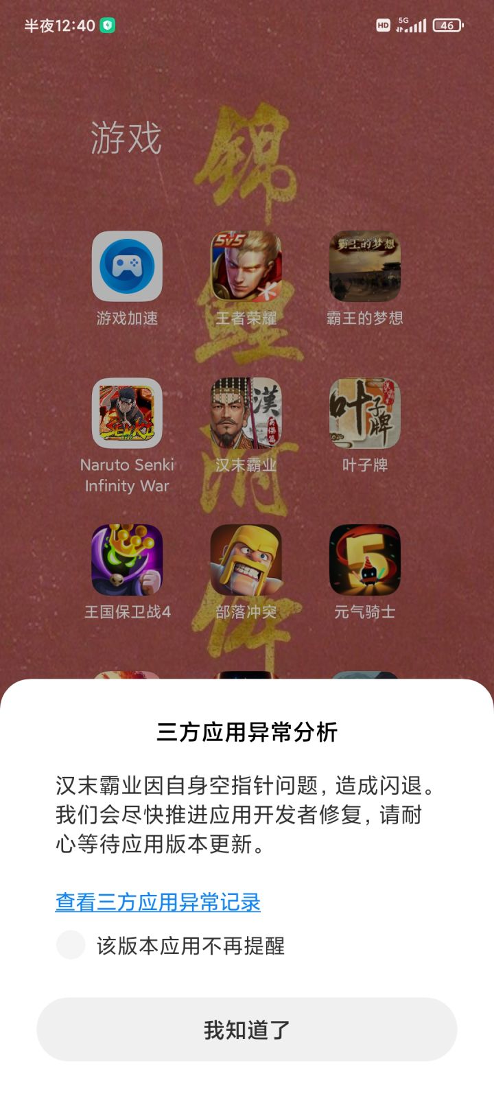 手机提示汉末霸业因空指针问题造成闪退,进不去是咋回事,上周玩还好好的。