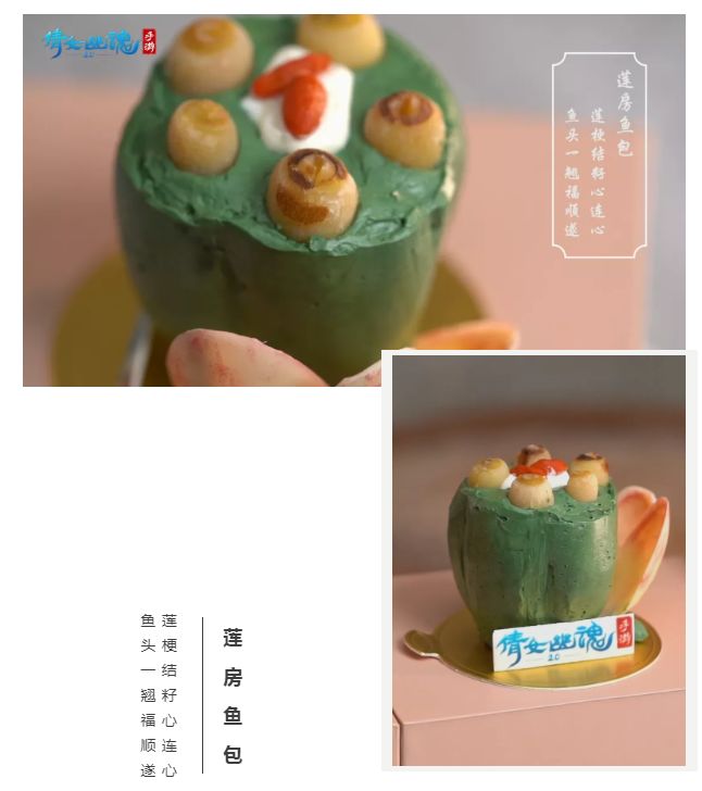 饱满的莲子、翠绿的莲房,旁边再配上捏制成的莲花花瓣,形态逼真,鱼莲鲜嫩,荷香四溢。