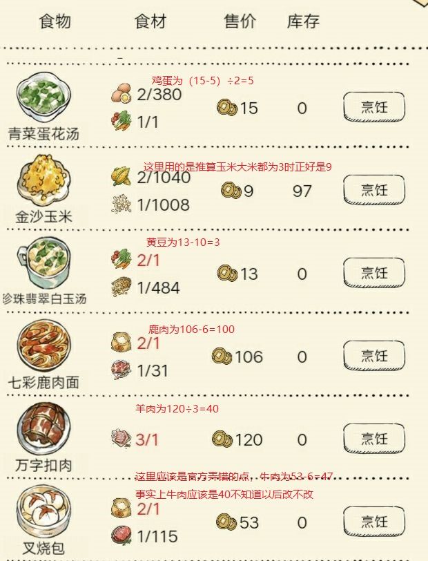 (羊肉甲鱼汤绝对性价比之王,蟹黄豆腐是因为可以消耗过剩的大豆,叉烧包可以消耗过剩的牛肉,万字扣肉因为材料太抢手,前期赚钱之王就没落了)