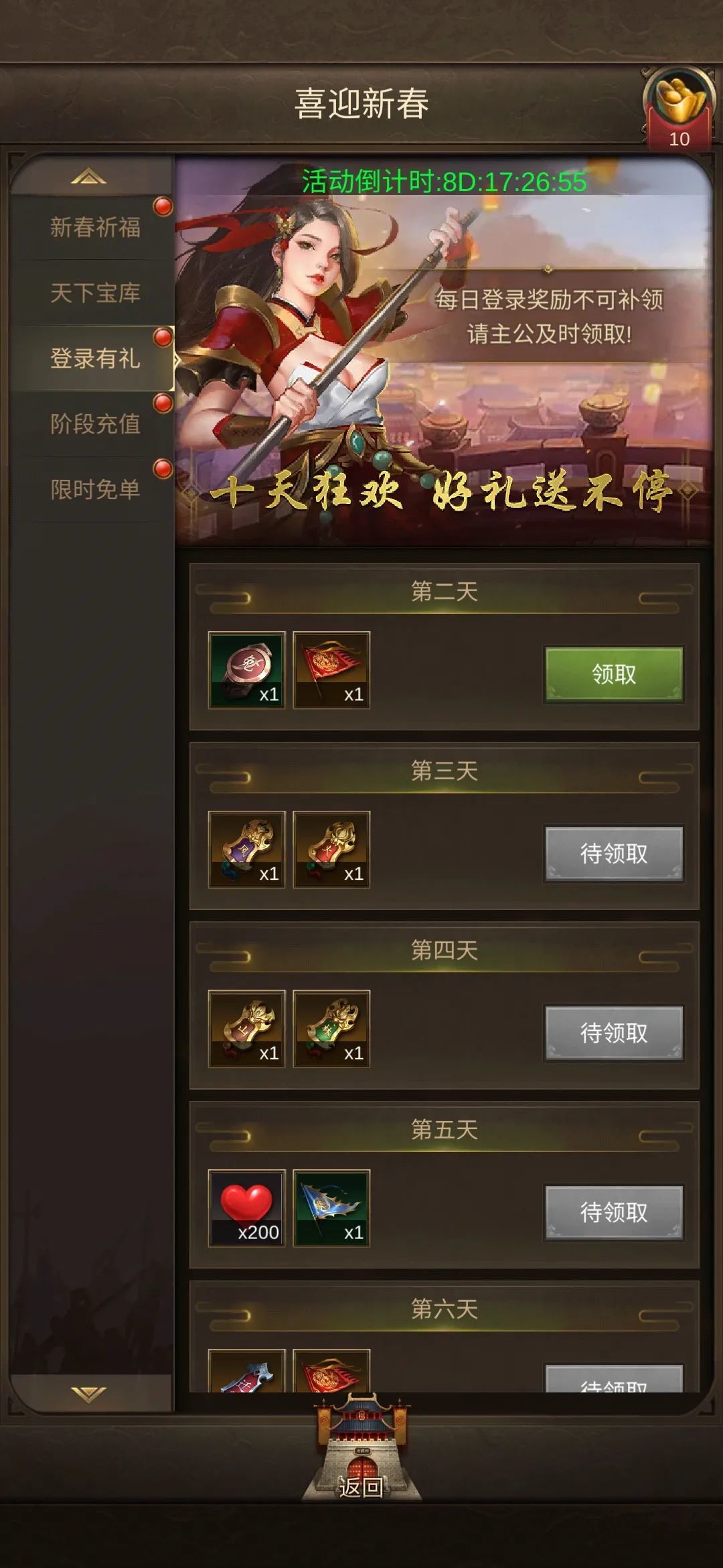 新年狂欢,福利不停!1月28日起,每日登录游戏,即可领取登录奖励。每日奖励不可补领,主公们要合理安排好时间哦~