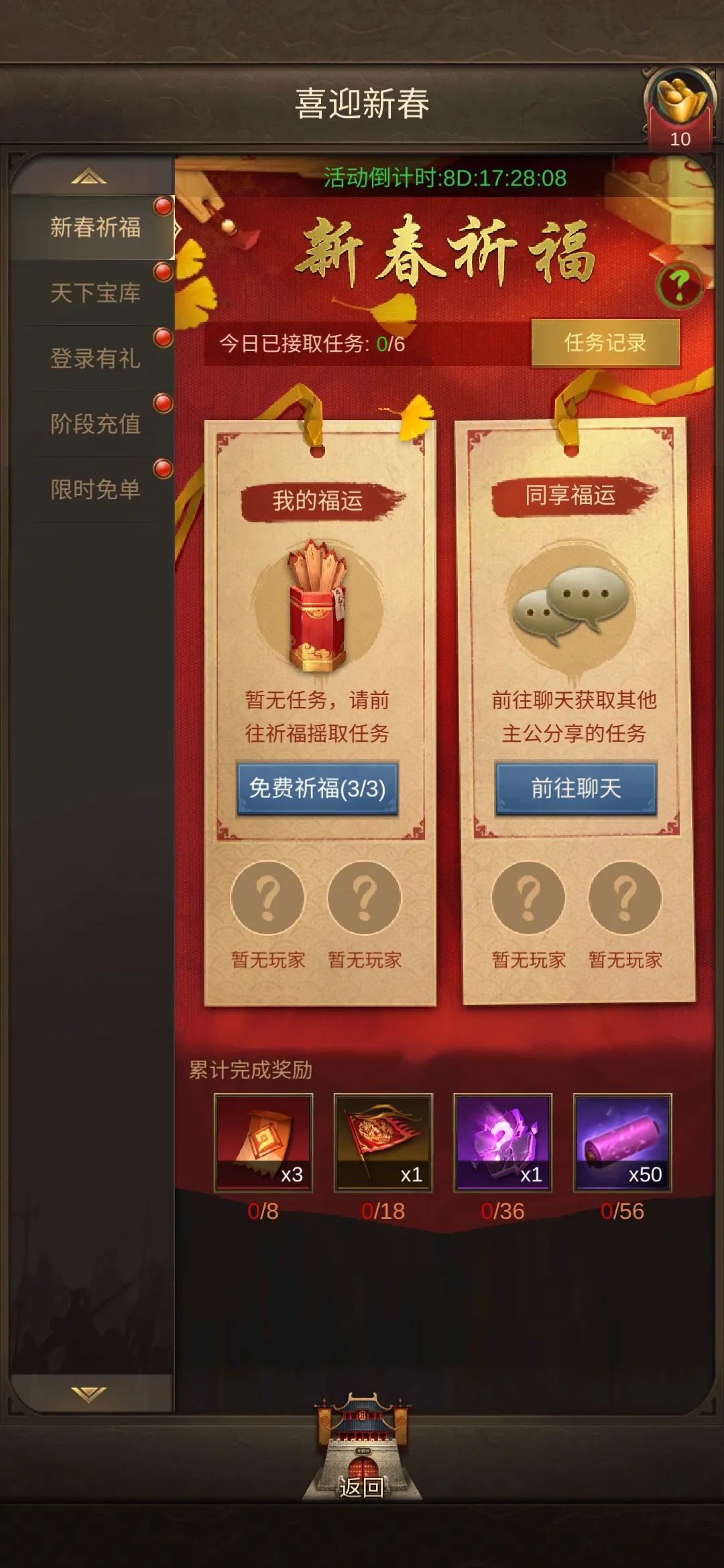 新春祈福,福运满满~活动期间,主公每日可免费祈福3次,付费祈福5次,数据于次日5点刷新。