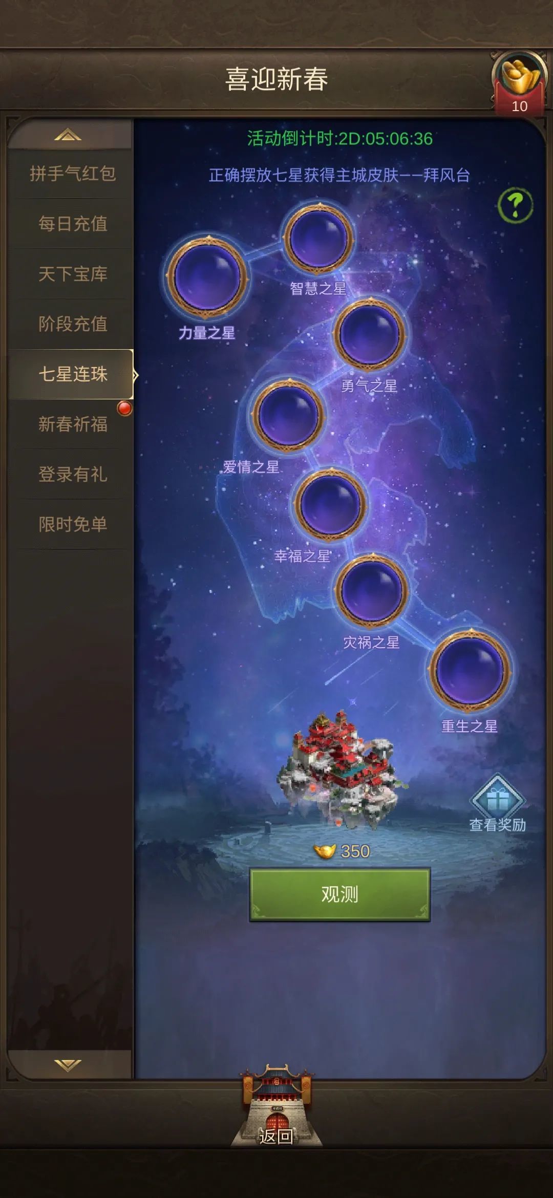 春节期间,参与七星连珠活动,观测星象即可获得游戏奖励~