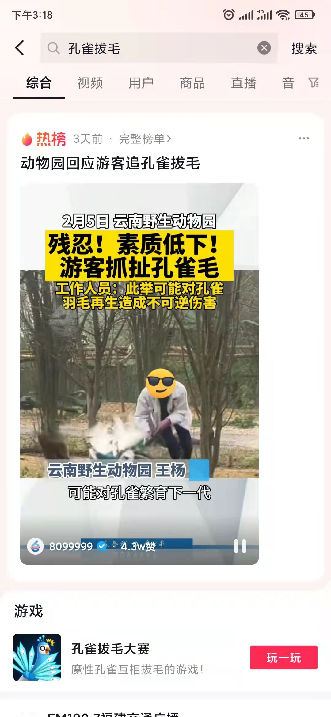 亲们,在游戏里孔雀拔孔雀的毛是没毛病的,但是千万不能去拔真孔雀的毛哟,会被警察叔叔抓起来的!