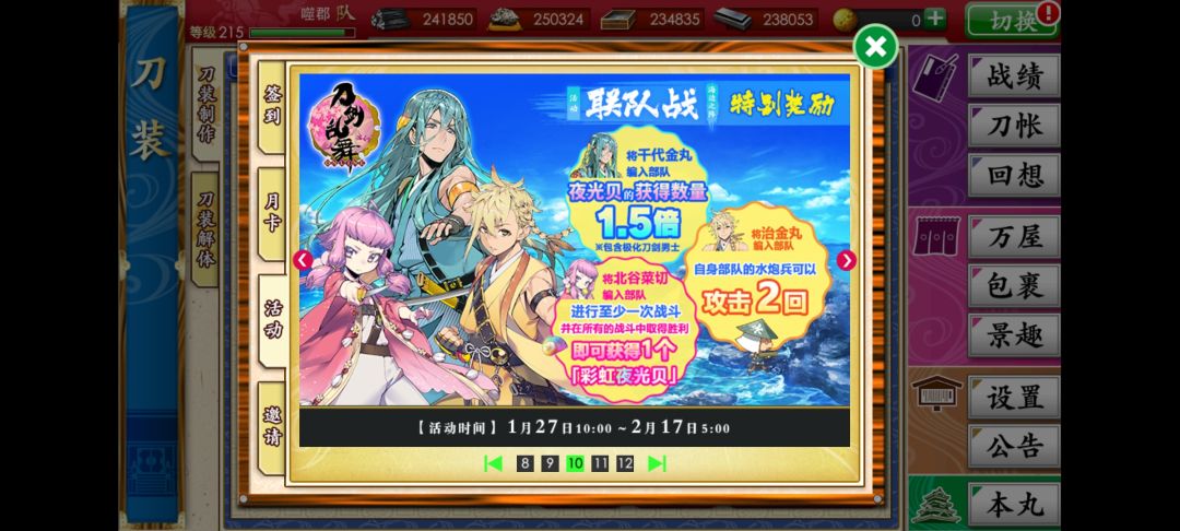 ①联战队活动前登录有送特上水炮兵*1+500夜光贝送的水炮兵御礼(10个特上水炮兵*10)