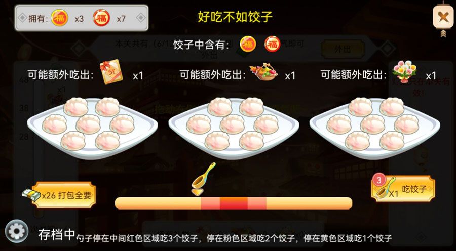 以吃饺子事件为例~在适当的时候投下勺子捞饺子,收集福字、贺卡、鲜花等礼物~【注意】获得饺子数量的顺序为:红色>粉色>黄色。