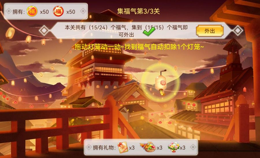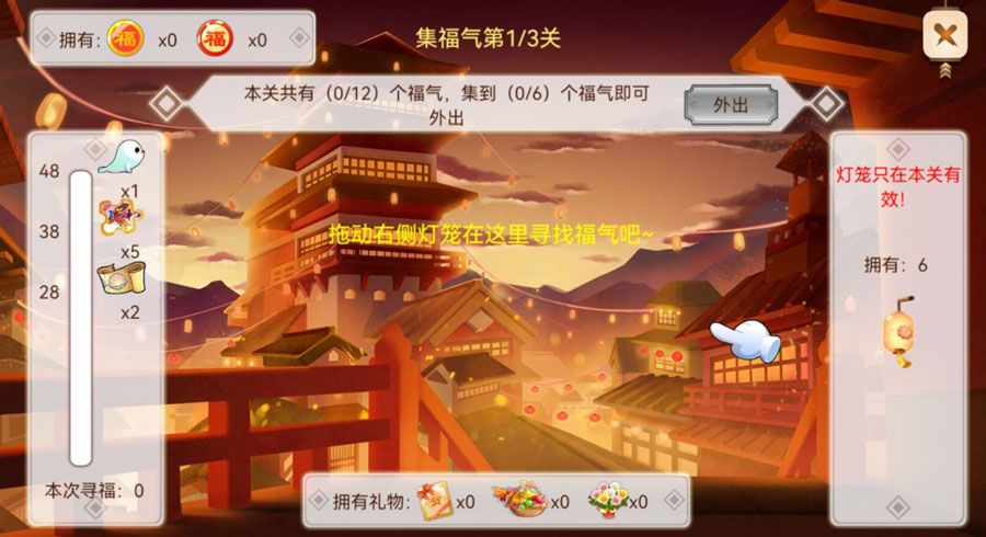 将右侧的灯笼拖动到场景中寻找福气。集齐n个福字即可外出获取其他道具。