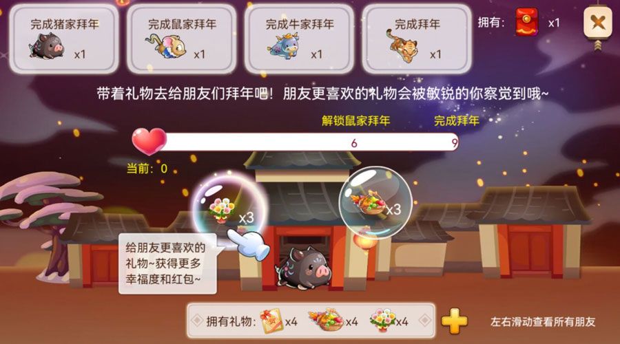 准备好礼物后,来朋友家拜个年吧!~给朋友送上小礼物,提升幸福度解锁下一家朋友的拜年机会,朋友还会送给你红包用在【带走小老虎】环节~完成拜年可以带走当前拜年家里的朋友~完成全部的拜年任务还可以带走雄壮威武东北虎~