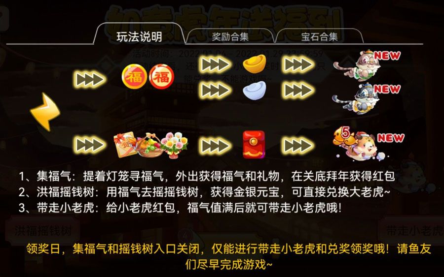 3、领奖日仅可进入带走小老虎(奖励兑换),大家获取的体力和道具要及时使用完毕;