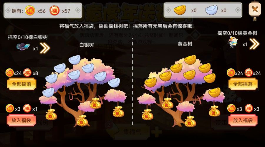 在洪福摇钱树中,将收集到的福字放入福袋,将树上的金、银元宝摇落,元宝在【带走小老虎】的【奖励兑换】中用来兑换如意、团圆虎~摇空整棵树还有额外惊喜~