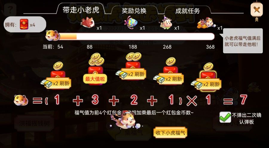 将前面环节收集到的红包送给小老虎,福气值为红包对应的数值计算而成。想更快、更多领福气值,可以将数字进行刷新~