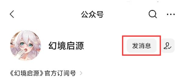 第一步:搜索“幻境启源”公众号,点击“发消息”