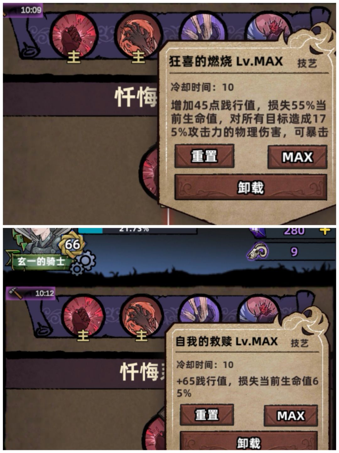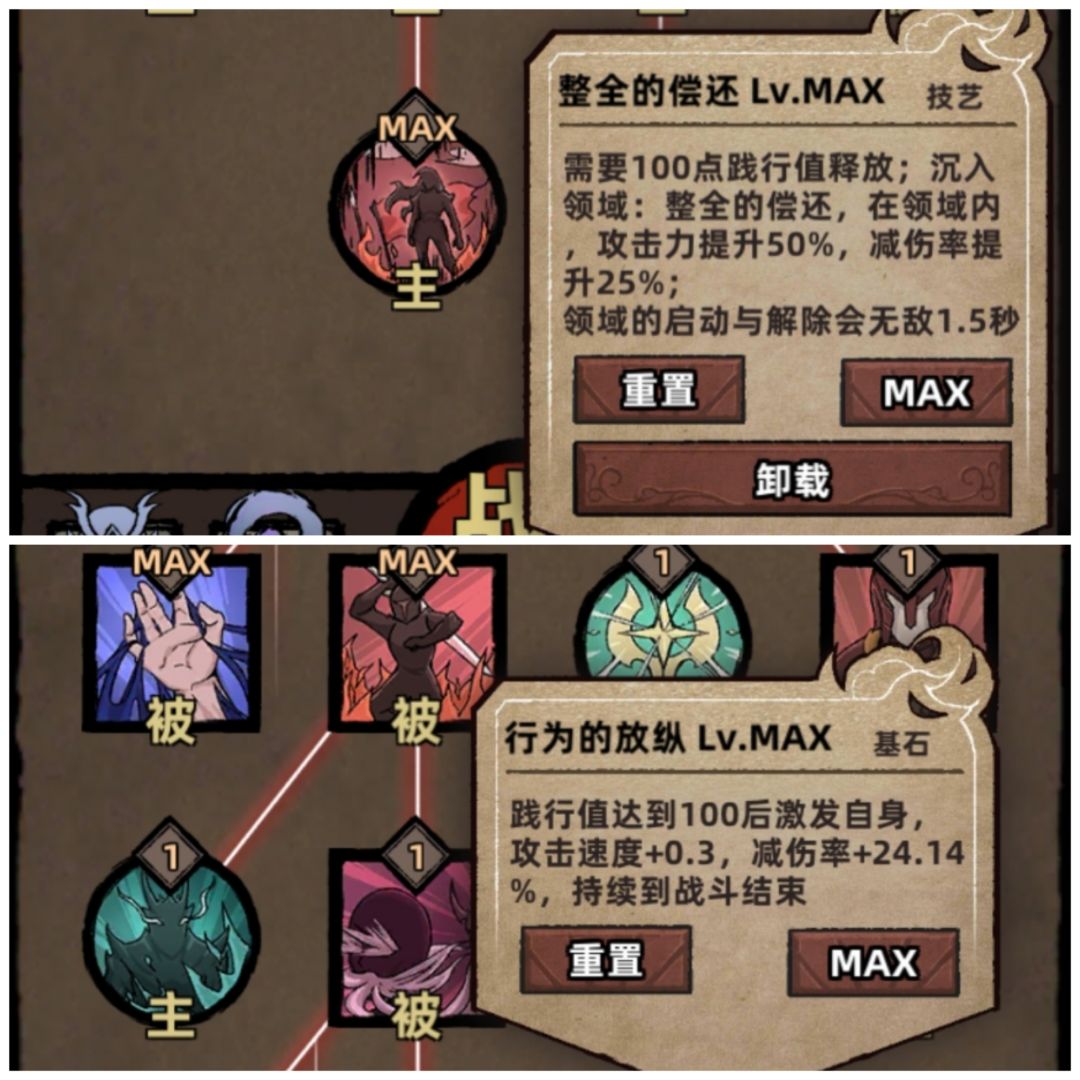 这两个技能必须践行值达到100,才能触发,所以堕落者套可以最大程度的发挥效果。