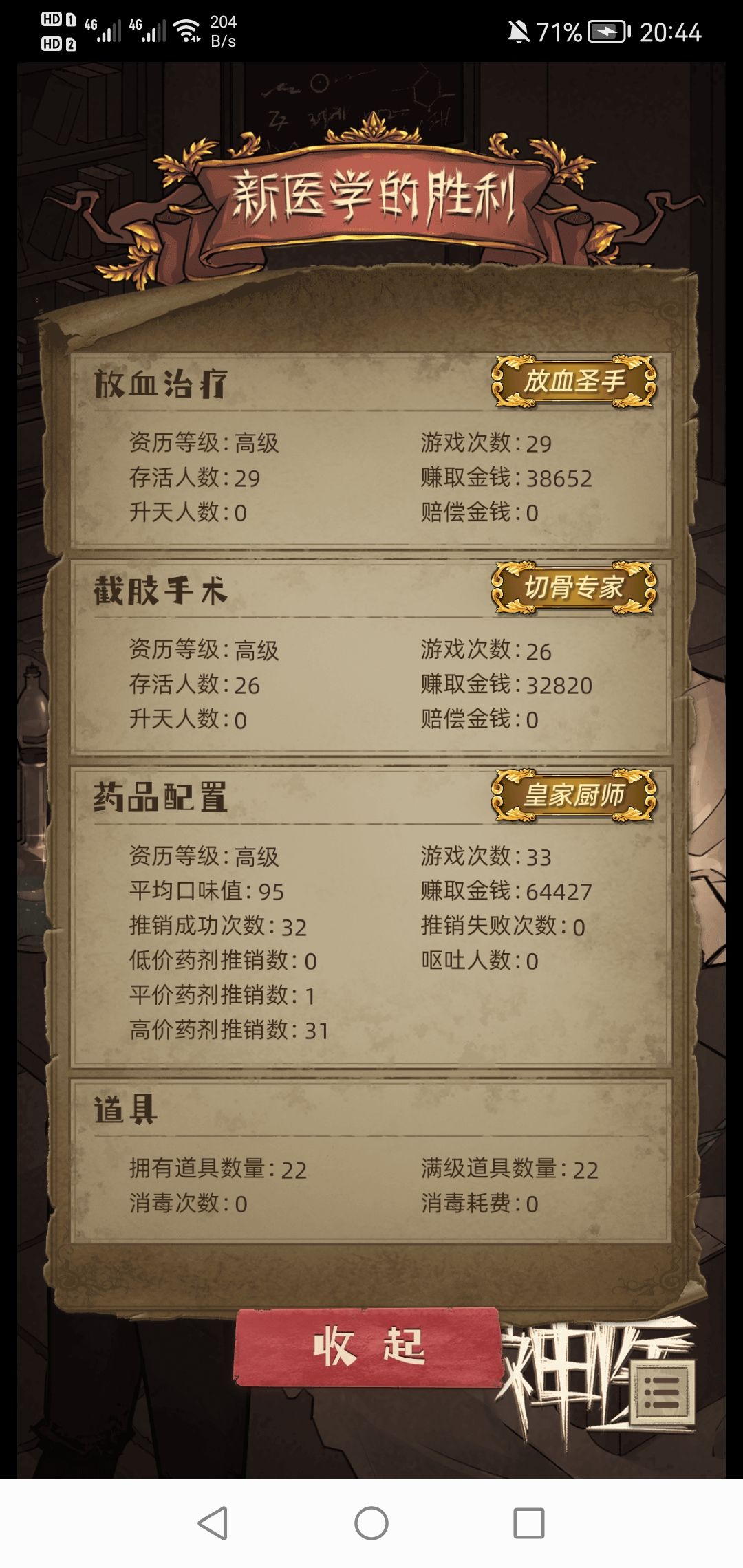 好吧其实截肢遇到商人带三个恶心词条加观众全满是会死的,所以道具只带萃取液或者不带。放血不会感染致死,可以带熏香降低升天率,然后黄色区间下刀拉满热情。