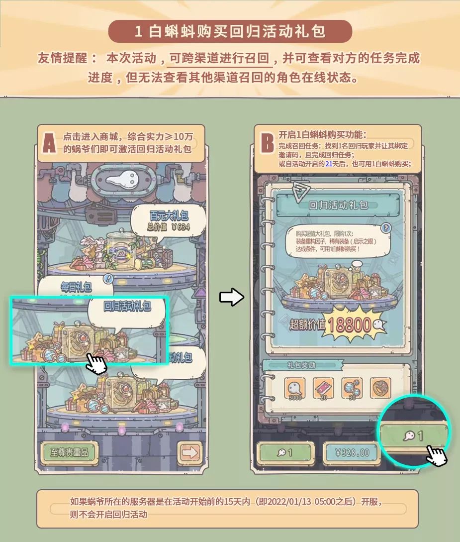 回归活动期间,自身综合实力不低于10万的蜗爷们,打开商城后会激活『回归活动礼包』,召集回归玩家绑定邀请码完成召回任务,或在活动开启的21天后,都可以花费1白蝌蚪购买该礼包!