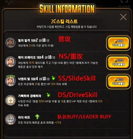 5:NS、SS、DS 每个天命都有对应的一套技能,普攻、重攻、SlideSkill、DriveSkill、LEADER BUFF,在天命的查看界面右边点击“技能”图标可以查看该天命的技能详情: