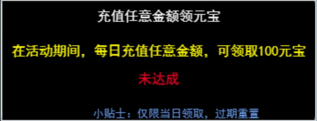 活动说明:在活动期间,每日充值任意金额,可领取100元宝(每天最多可领取1次)。