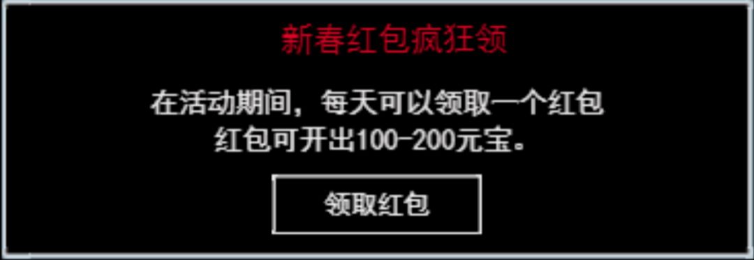 活动说明:在活动期间,每天可领取1个红包,红包随机开出100-200之间的元宝。