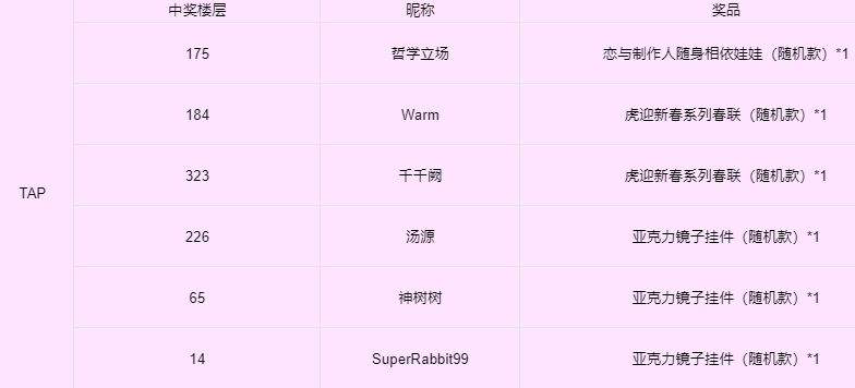 (图中随机数对应楼层的用户为中奖用户)请对应楼层的制作人们在2022年3月20日前添加叠纸福利小助手QQ:1917924997,提供详细地址。我们会在收到地址的7-10个工作日内寄出哦~添加小助手QQ时请备注:TapTap领奖+获奖昵称