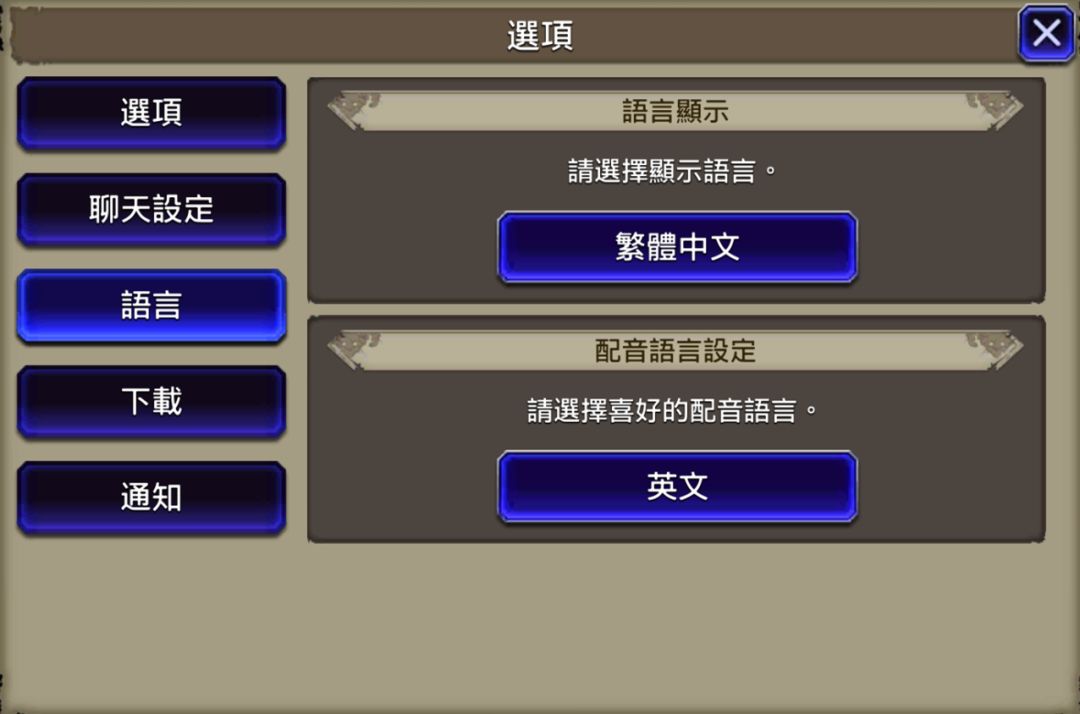 游戏中是在下图这个界面进行账号绑定与语言的设置。