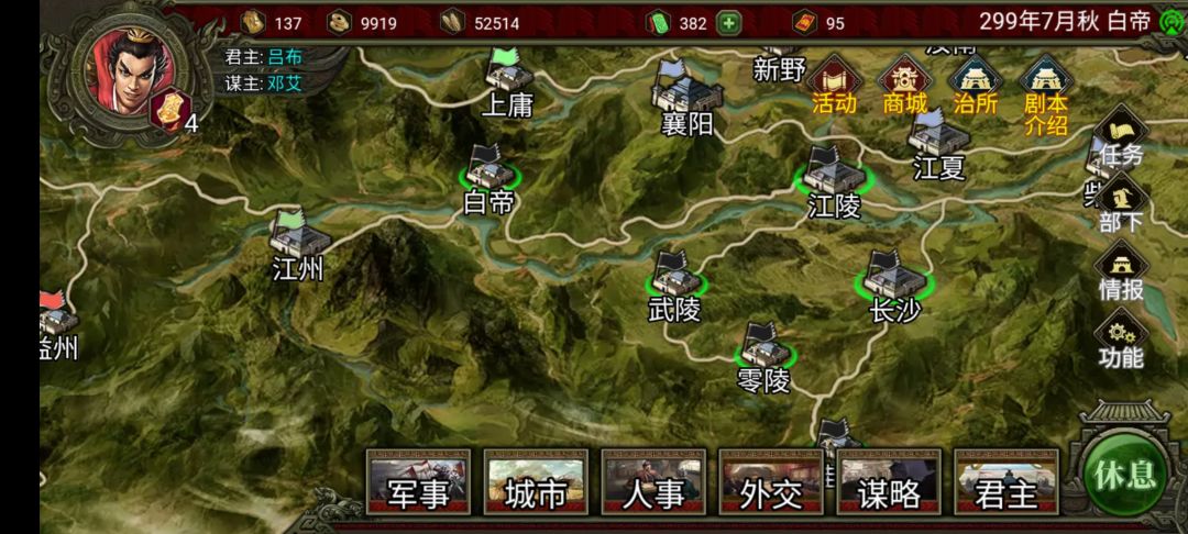 这时候我们就可以当舔狗了,让开局刷的那个高政治的舔着脸给那个邻居送上宝物(我只有开寻访送的那个摸金符,你们应该有其他的东西的)接着寻求同盟,等他答应了,就求他出兵攻打武陵,我们就有三个城了,剩下的就简单了,因为长沙跟江陵被盟友把路堵上了,我们安心种田😌,如果别人打他,我们就派射手去帮忙防守,这期间除了种田以外,核心就是刷商城的初级名气跟经验给吕布早日出连珠,直到看门的大哥不愿意同盟为止,一旦停止同盟就需要时刻注意这位大哥对我们的敌意值,只要有敌意了就第一时间送上物资舔好他,等到外面有人拆掉大哥的江陵的时候,我们趁他病要他命,拿下他的长沙,(如果被打掉的是长沙就回档,因为我们拿江陵会面对太多人)接着给边上的那个新大哥送上物资,继续舔好他,控制好他的敌意值(通常不会同意同盟)