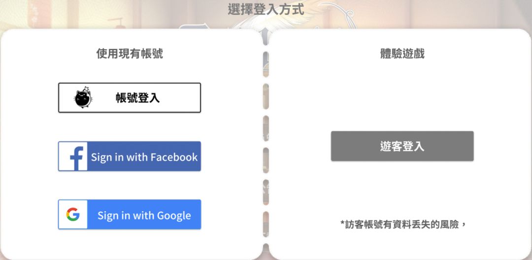 谷哥登录、FB登录、账号登入,游客登入这三种,选择适合自己的就好了