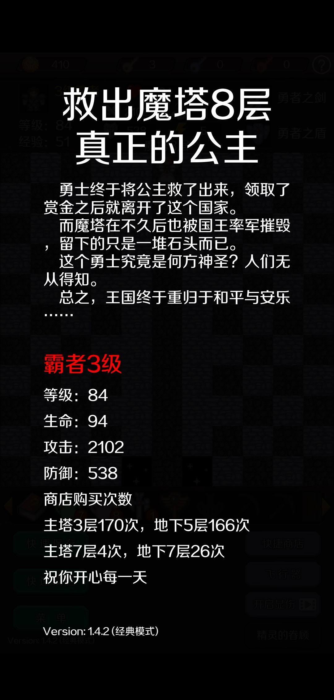 4.回第8层,杀一个史莱姆人、一个魔法师。回第7层开黄门杀骷髅,买攻击。回第8层,杀一个黄魔法师拿红蓝宝石,让老人开启快捷商店,无伤杀剩下的一个魔法师。爆攻霸者第一阶段至此结束。
