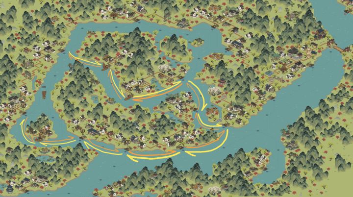 在评论区经过大佬指点之后总结出的这条路线单位步数收益更高,51步33码头(3程),但风险也可能更高