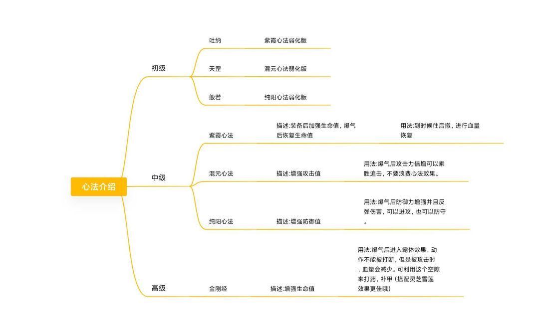 初级的吐纳,天罡,般若心法,分别对应中级的紫霞,混元,纯阳心法,在这里就不多做介绍了,只要知道属性是一样的,只是弱化版本就好。