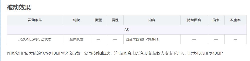 另外在开启火阵后,自身的被动是回合末回血和蓝,这一点在一些回合数较长的战斗中表现比较优异;