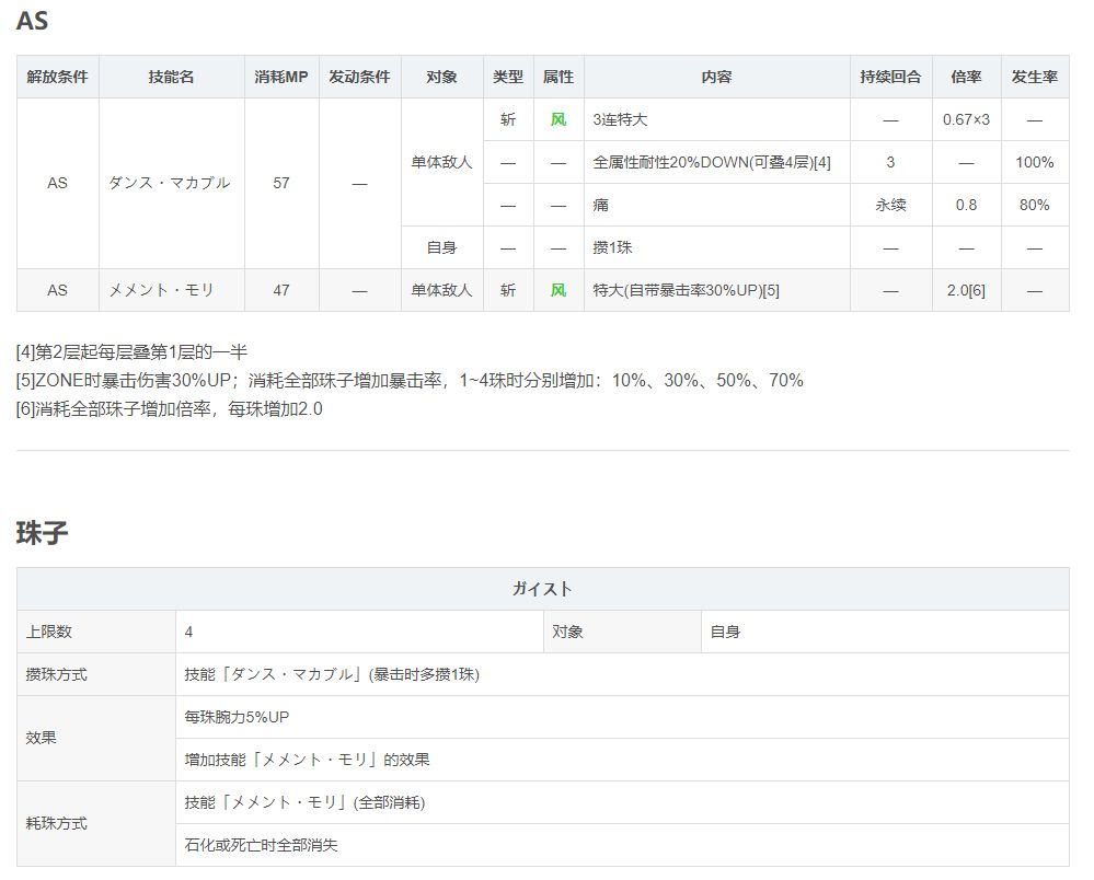 辅助而言:同时有一个腕力&弓伤30UP的辅助buff,AOE技能可以有效的降低敌人的火耐,提高我方的风耐;