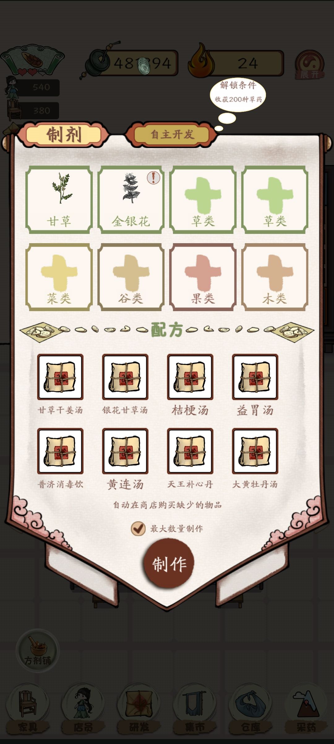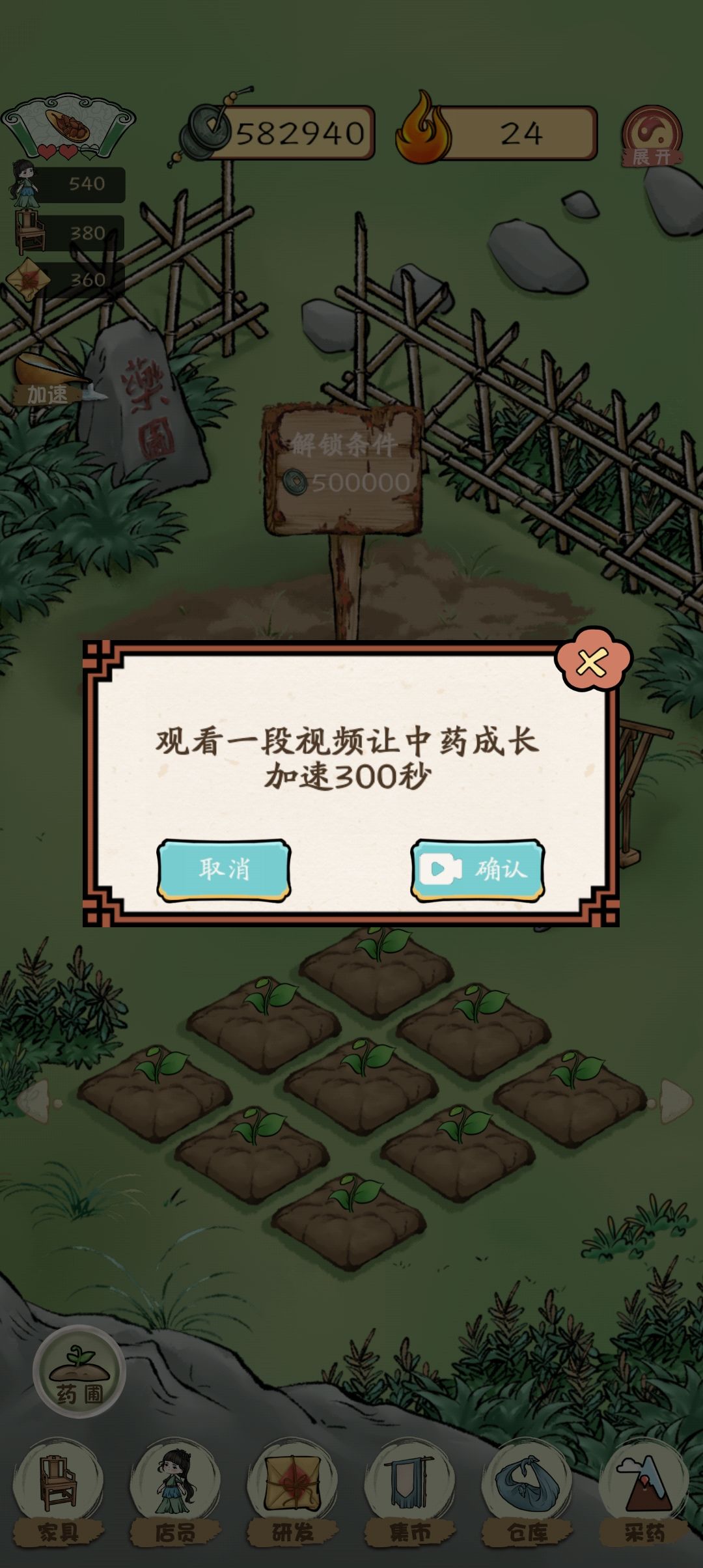 想要快速赚钱就需要我们摆满桌子后看宣传的广告,同时可以看药圃的加速广告以满足药剂(主要推荐甘草生干姜汤)的供应。