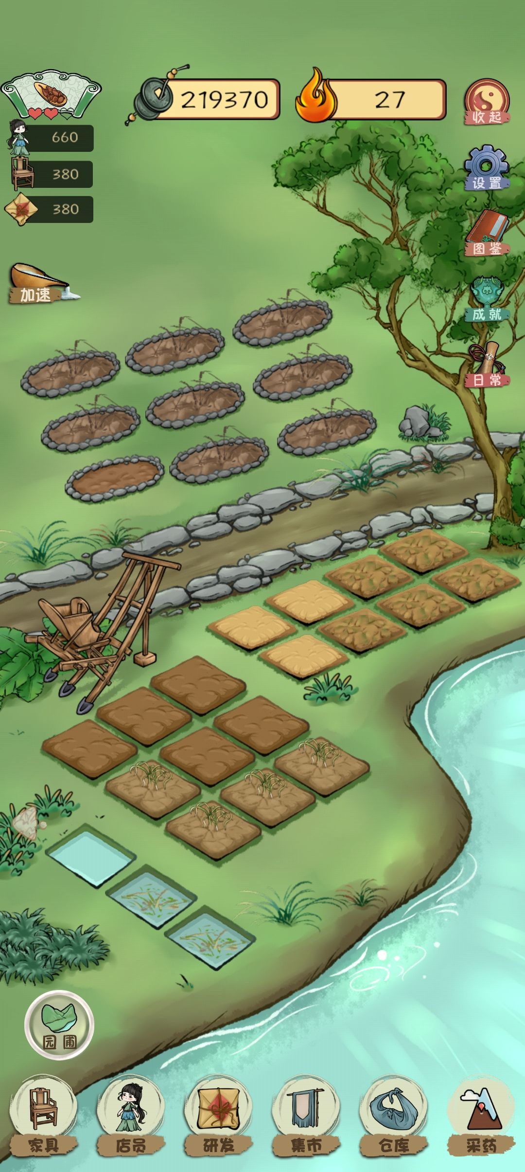而园圃需要收集20个草药及15点🔥解锁。草药可以通过商人、集市种子种植来解锁,很快就能完成。🔥可以通过开垦土地来获得,其他途径未知。不知道是不是bug,本人是在14🔥的时候就解锁的园圃。园圃中的土地价格略低于药圃,同样需要一格一格解锁,开垦玩成无额外土地。