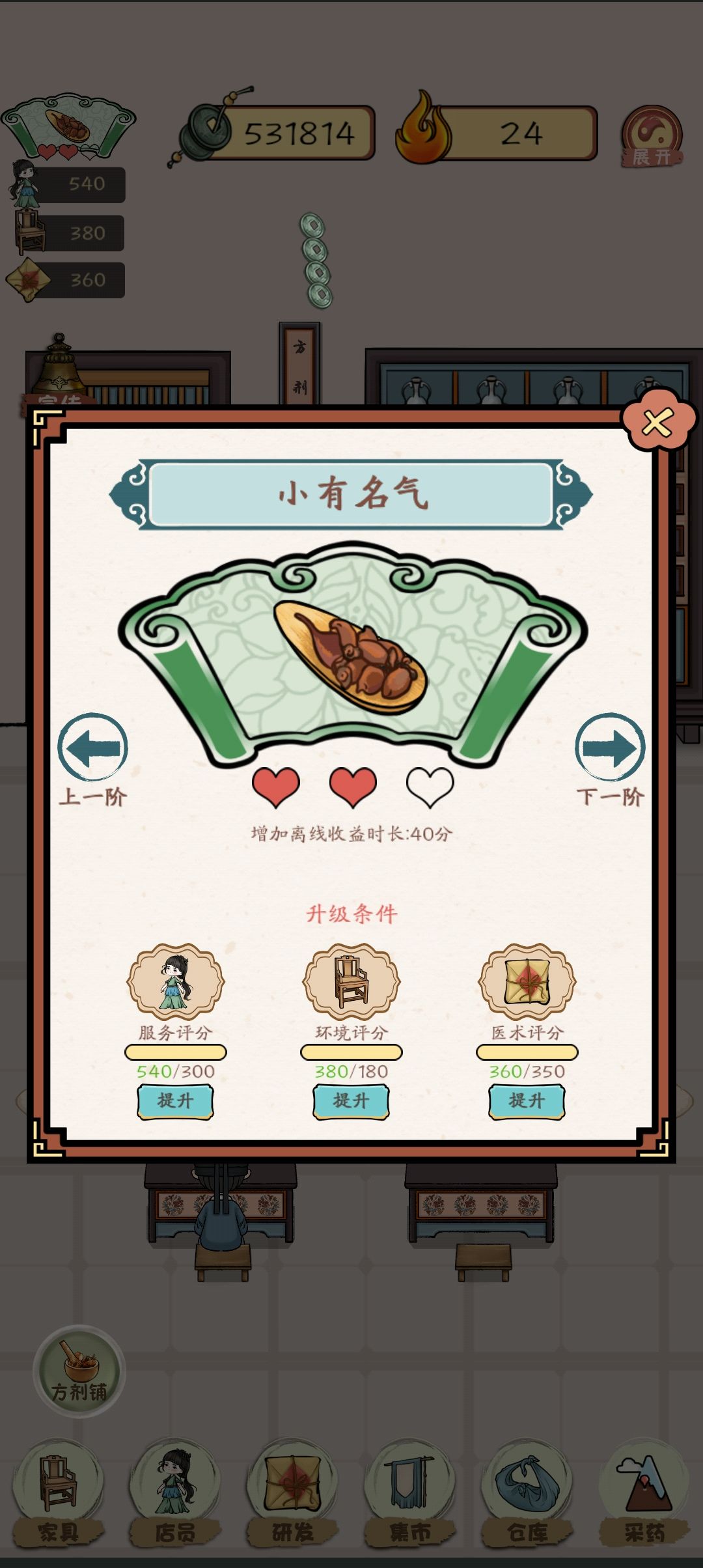 其次,给大家介绍游戏前期铜钱的主要来源——方剂铺。在最初始阶段玩家只拥有一张桌子一位郎中。升级桌子可以增加方剂铺的环境评分,升级郎中可以增加方剂铺的服务评分,治疗一定数目的病人获得猫咪的礼物可以研发新的药剂,增加医术评分。而三者达到一定数目则可以提升自己店铺的口碑增加离线收益。