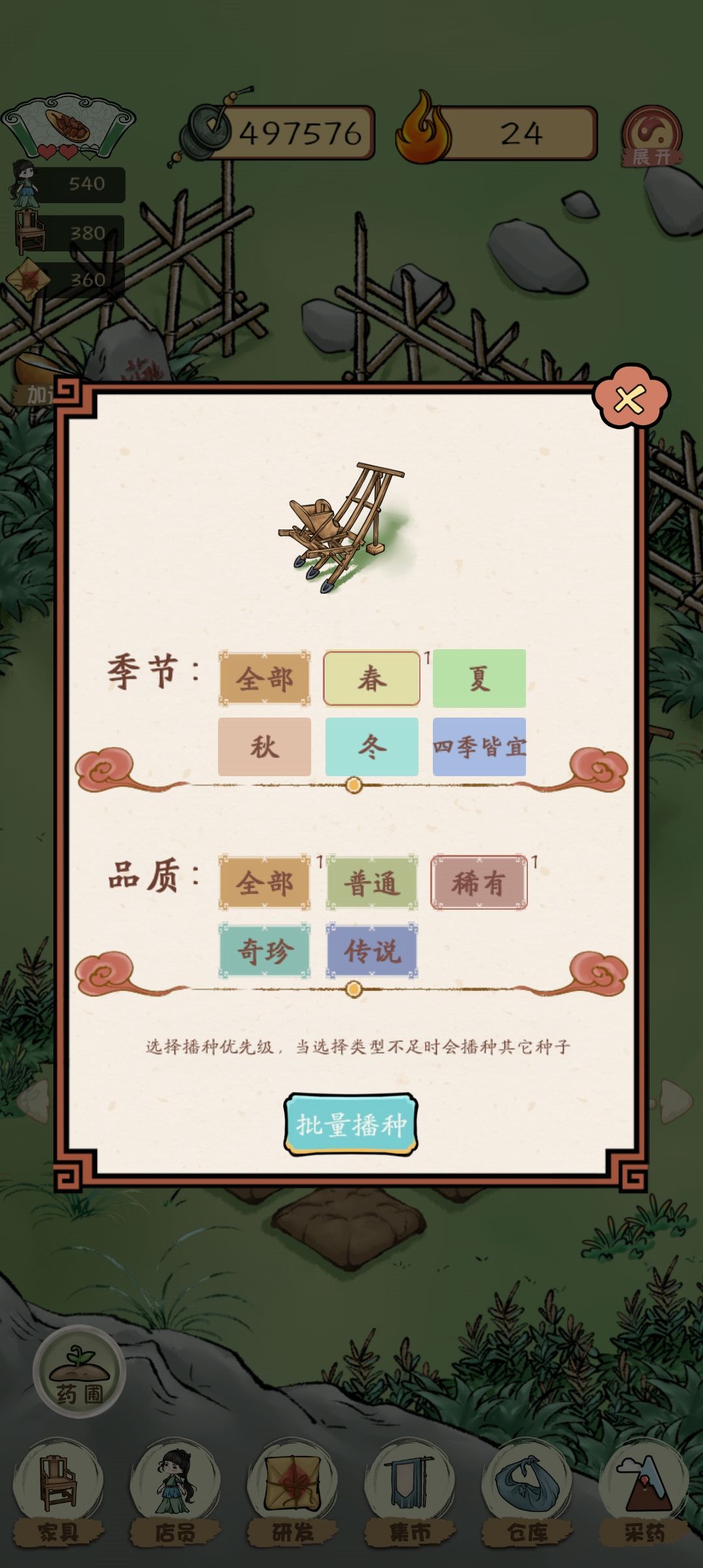 解锁后可以在药圃及园圃同时使用,但是播种机本身不可以直接选择想要播种的种子,只能根据药的季节设定(在集市购买时的收获时间可见)和品质(相同颜色对应相同品质)来一键播种。需要注意的是这个筛选出来的种子并不是唯一的(以春季稀有为例则会筛选出甘草、沙参两种种子),并且如果你只希望播种其中一种种子,需要在包里装备好足够当前田地种植都种子数目,否则播种机将会自动为剩下的空余田地种下你背包中剩余的种子(不管是否符合你的筛选条件!!!)