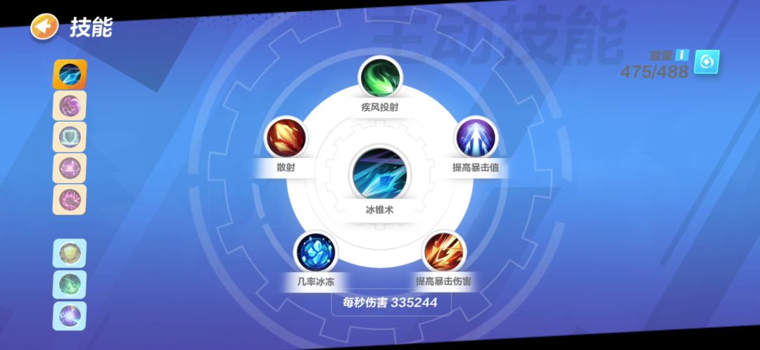 在此基础上,那么我所需要的就是先定下主伤技能,再根据技能打造体系。70级时可以买的主被动光环触发这些技能基本已经齐全,但开技能搭配需装备能量,而后发现低使用等级,高装备等级(80级以上最好)在装备赋能时能给的性价比最高,且低等级装备有部分非常适合冰锥的前期玩法。选择冰锥是因为散射范围广,射击距离远能到屏幕之外,且冰冻效果在低生存能力时清怪非常友好,且多数boss都吃冰冻,冰锥吃投射物、法术伤害和元素伤害三加成,最重要的是他有紫色技能特效。