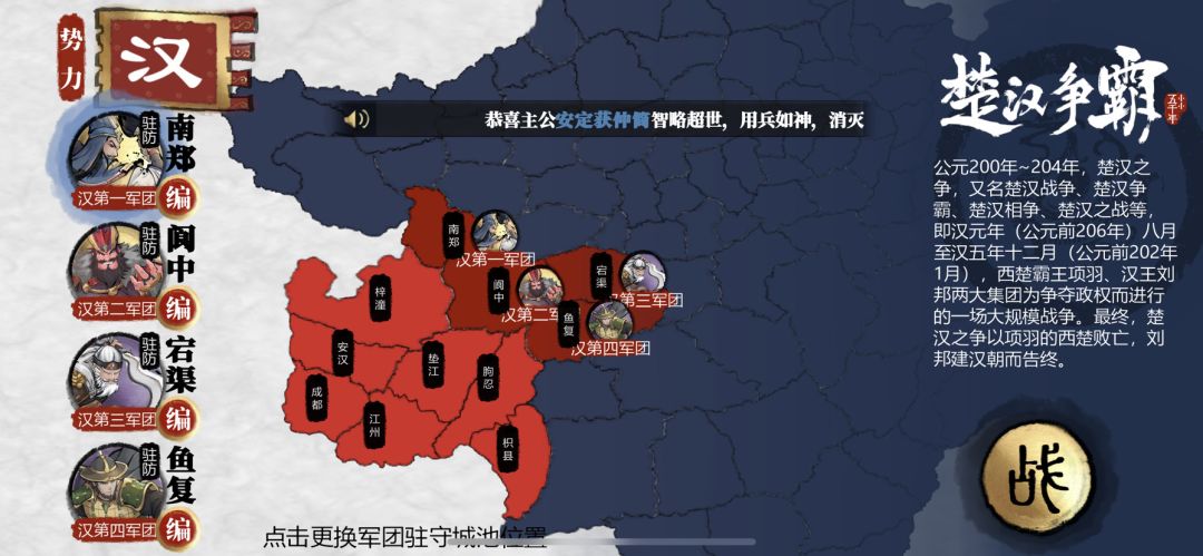 1)进攻路线推荐大家可以看出来楚汉大地图一个周目肯定是无法解锁全成就的下来开始进行进攻推荐: